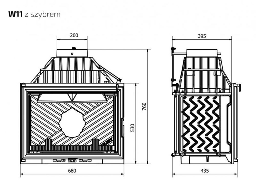 Os elementos da lareira são aparafusados, não soldados, o que previne ainda mais o estresse dentro da estrutura. Cada uma das nossas lareiras está equipada com uma parede traseira dupla removível. Essa solução garante que a maior carga de calor seja transferida para o elemento que pode ser facilmente substituído, sem afetar o projeto da lareira e do alojamento. O ar pode ser fornecido para a câmara de combustão a partir do exterior por meio de elementos adicionais. Classificação energética: A.