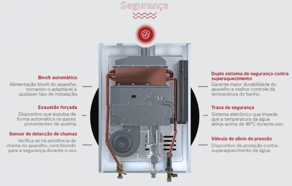 Duplo sistema de segurança contra superaquecimento - Garante maior durabilidade do aparelho e melhor controle da temperatura do banho.