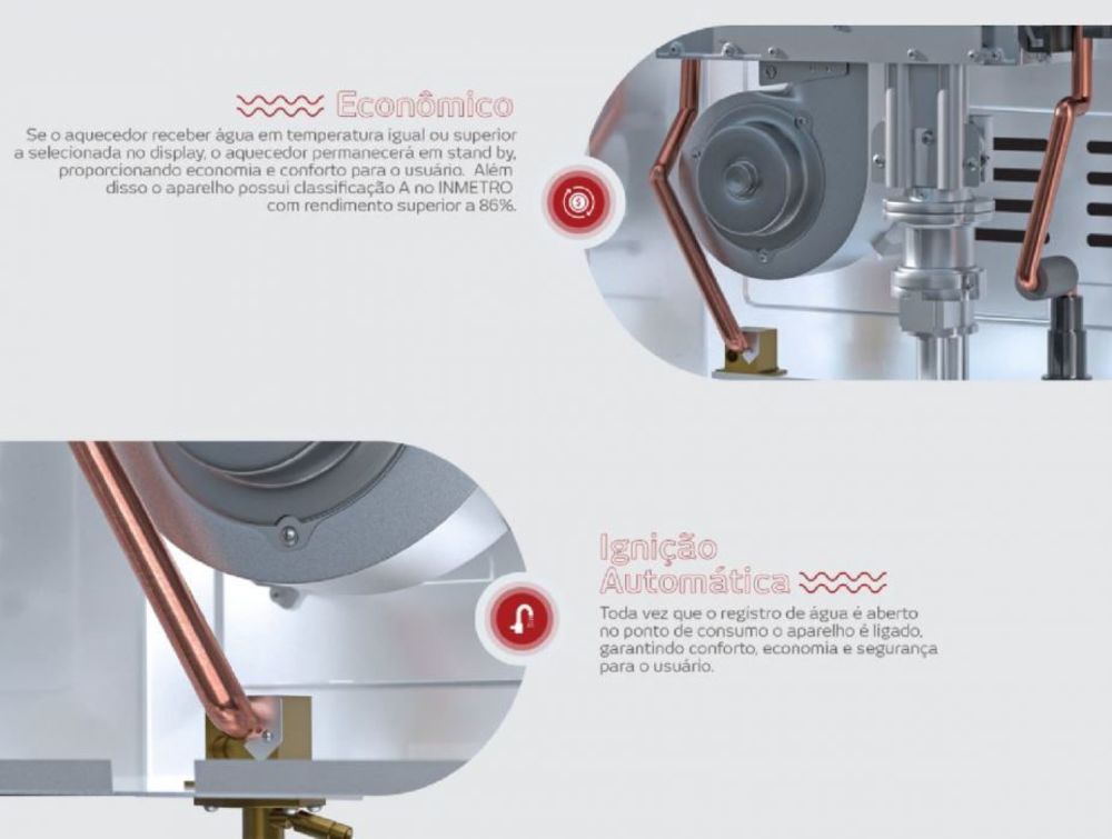 Se o Aquecedor receber água em temperatura igual ou superior a selecionada no display, o aquecedor permanecerá em stand by, proporcionando economia e conforto para o usuário. Além disso o aparelho possui classificação A no INMETRO com rendimento superior a 86%
