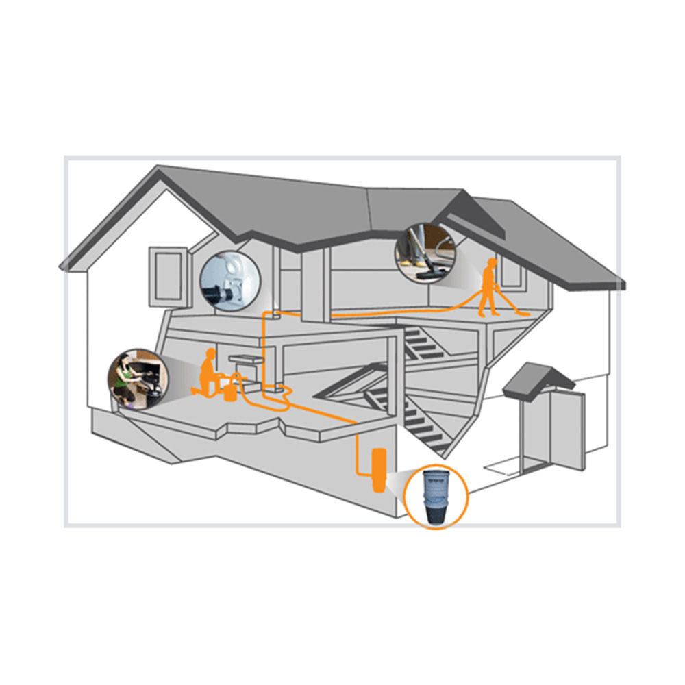 A sujeira, poeira, ácaros, fungos e bactérias são conduzidos até a central de aspiração, através da rede de tubulação e depositados no reservatório da central de aspiração. O ar aspirado depois de passar pelo sistema de filtragem da central, é conduzido para o exterior através de tubulação de PVC 50 mm.